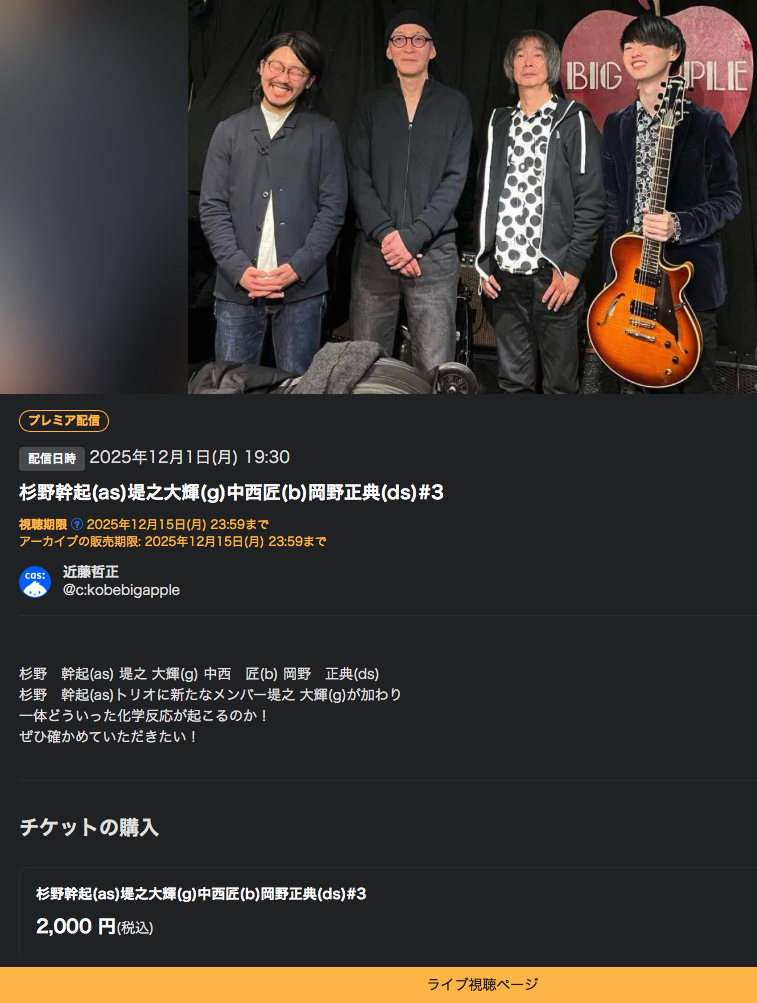 | 12/1月 | 杉野 幹起(as) 堤之 大輝(g) 中西 匠(b) 岡野 正典(ds) ツイキャスにて有料ですがlive配信もします! |