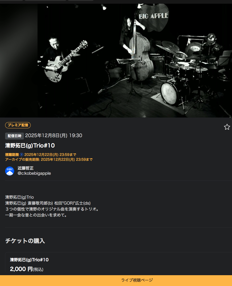 | 12/8月 | 清野 拓巳(g) 斎藤 敬司郎(b) 松田”GORI”広士(ds) ツイキャスにて有料ですがlive配信もします! |