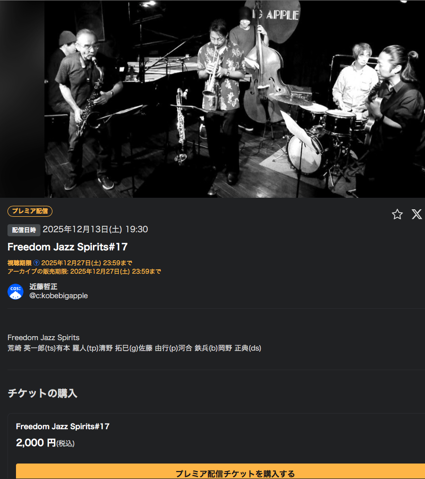 | 12/13土 | 『 Freedom Jazz Spirits 』 ツイキャスにて有料ですがlive配信もします! |
