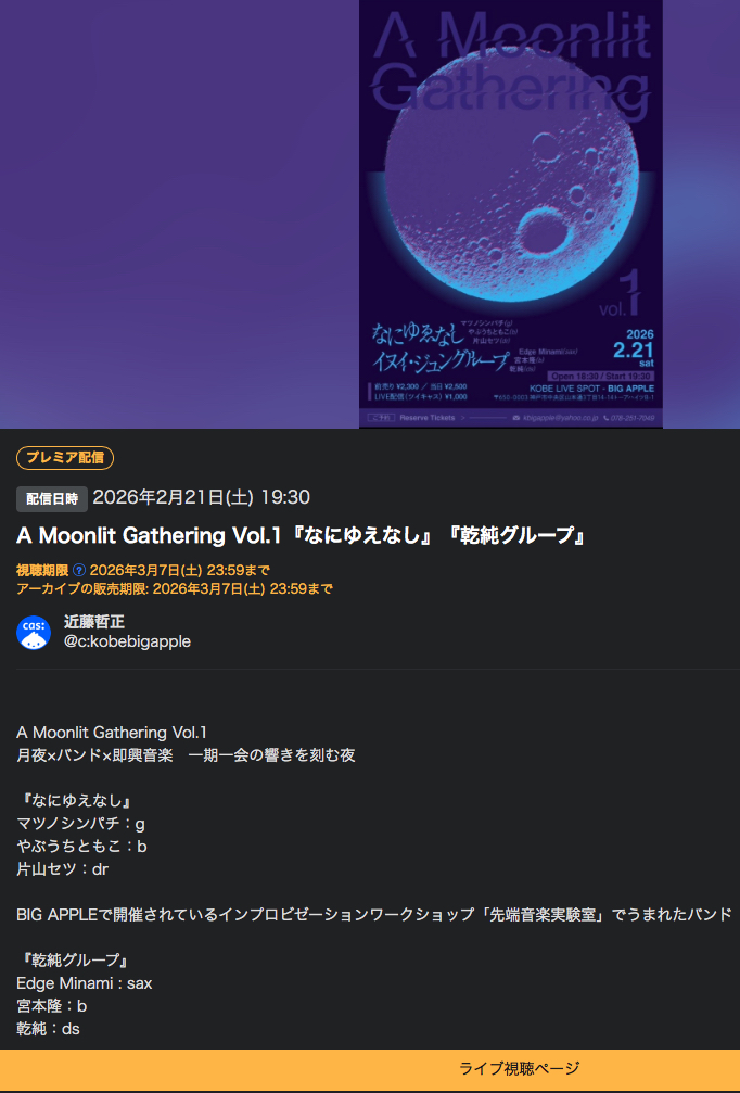 | 2/21土 | 1,マツノシンパチ(g) やぶうちともこ(b) 片山セツ(ds) ツイキャスにて有料ですがlive配信もします! |