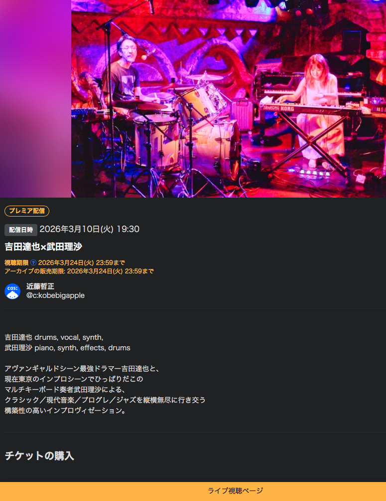| 3/10火 | 吉田 達也(ds,voice) 武田 理沙(p,key) ツイキャスにて有料ですがlive配信もします! |