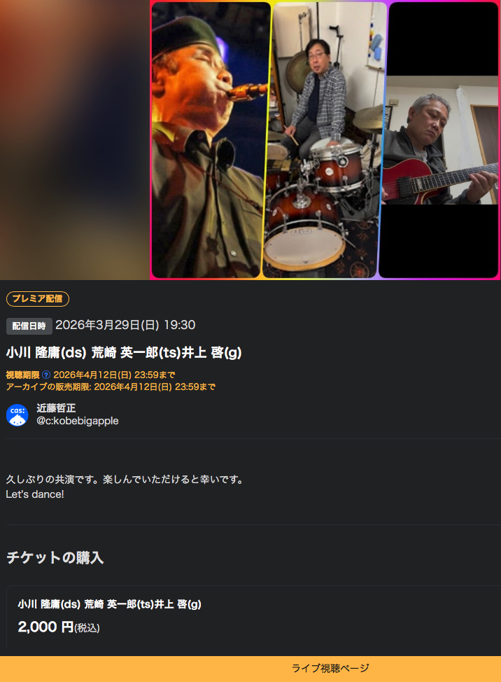 | 3/29日 | 小川 隆庸(ds) 荒崎 英一郎(ts)井上 啓(g) ツイキャスにて有料ですがlive配信もします!