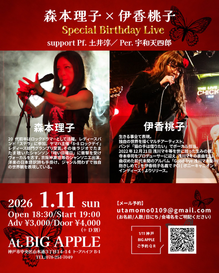 | 1/11日 | 伊香 桃子(vo,g) 森本 理子(vo) 土井 淳(p) 宇和 天四郎(perc)