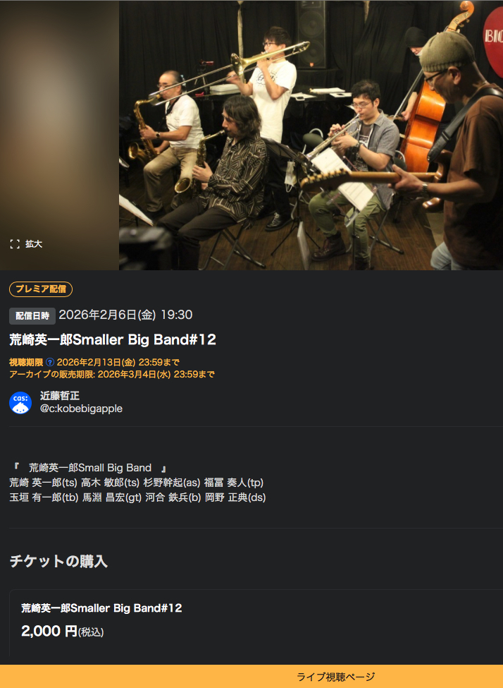 | 2/6金 | 『 荒崎英一郎Smaller Big Band 』 ツイキャスにて有料ですがlive配信もします! |