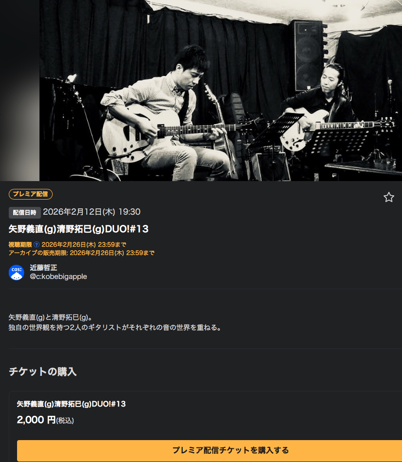 | 2/12木 | 矢野 義直(g) 清野 拓巳(g) ツイキャスにて有料ですがlive配信もします! |