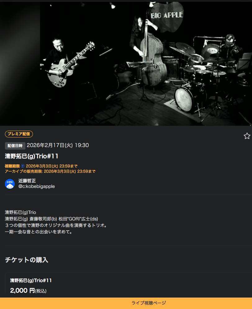 | 2/17火 | 清野 拓巳(g) 斎藤 敬司郎(b) 松田”GORI”広士(ds) ツイキャスにて有料ですがlive配信もします! |