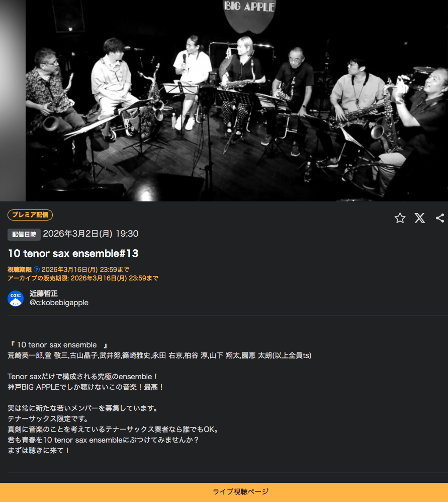 | 3/2月 | 『 10 tenor sax ensemble 』 ツイキャスにて有料ですがlive配信もします! |