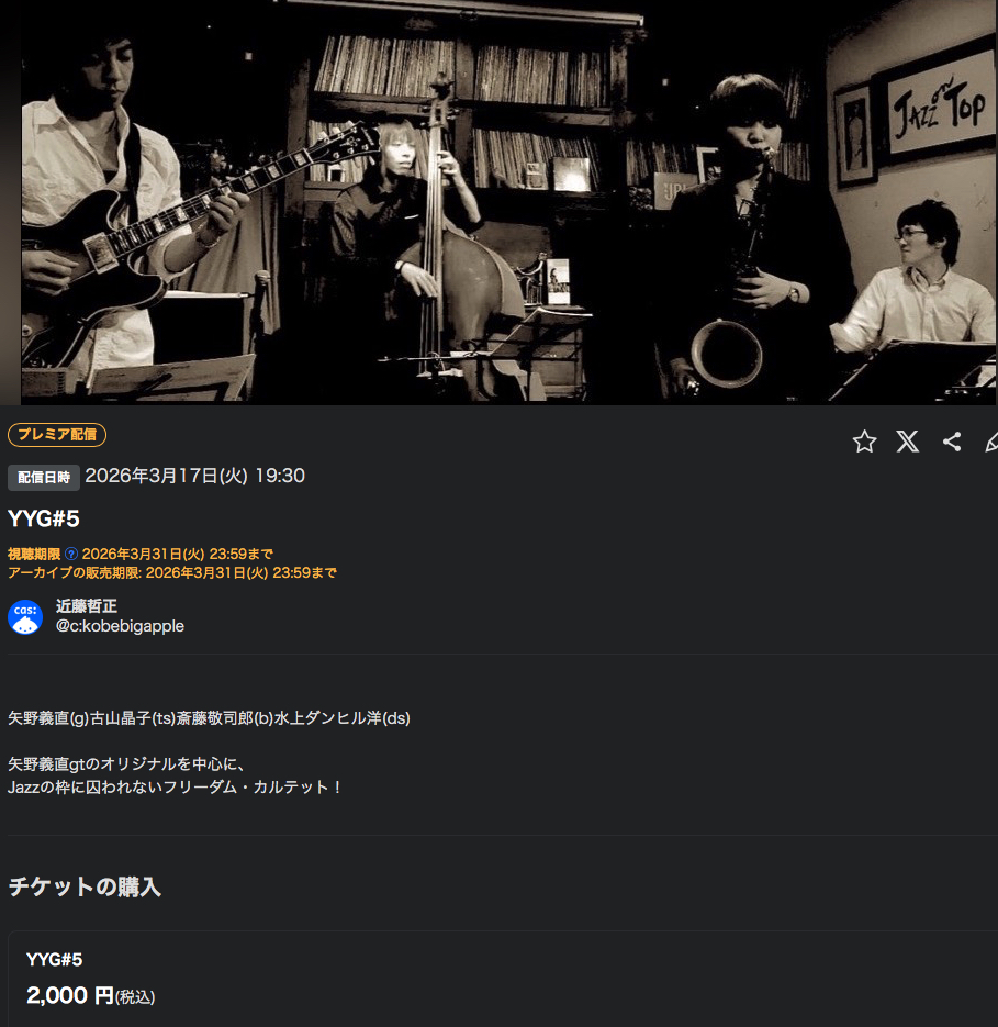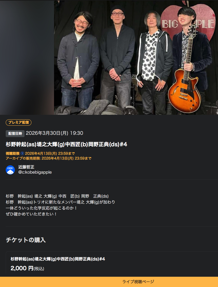 | 3/30月 | 杉野 幹起(as) 堤之 大輝(g) 中西 匠(b) 岡野 正典(ds) ツイキャスにて有料ですがlive配信もします! |