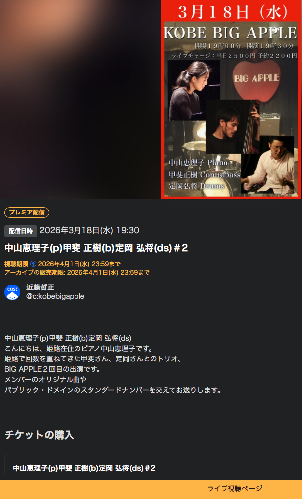 | 3/18水 | 中山 恵理子(p) 甲斐 正樹(b) 定岡 弘将(ds) ツイキャスにて有料ですがlive配信もします! |