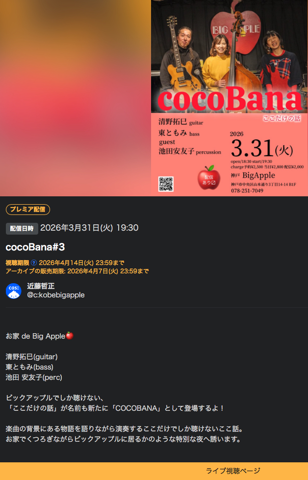 | 3/31火 | 『 cocoBana ! 』 ツイキャスにて有料ですがlive配信もします! |
