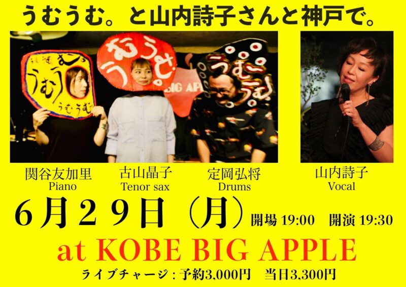 | 6/29月 | 『 うむうむ。』 定岡 弘将(ds) 古山 晶子(ts) 関谷 友加里(p) guest : 山内 詩子(vo) | 前¥3,000- 当¥3,300- |