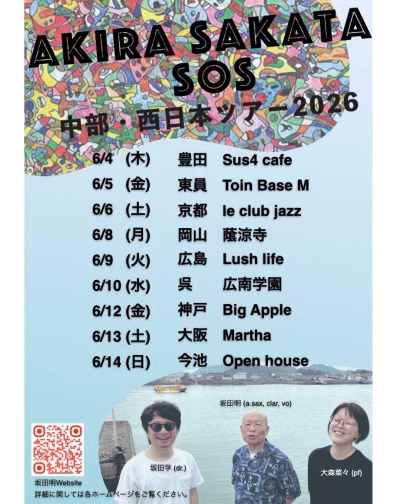 | 6/12金 | 『 坂田明SOS 』 坂田明(as,cl,vo) 大森 菜々(p) 坂田学(drums) | 前¥5,000- 当¥5,500- |