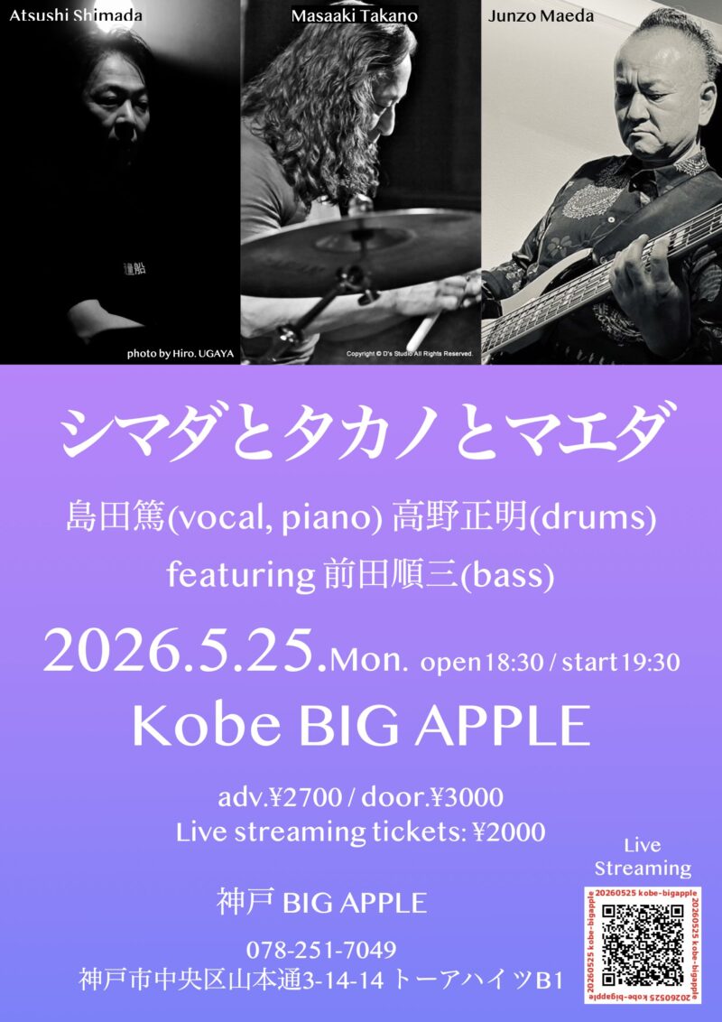 | 5/25月 | 『 シマダとタカノとマエダ 』●出演:島田篤(vocal, piano) 高野正明(drums, percussion)☆ Special Guest:前田順三(bass)ツイキャスにて有料ですがlive配信もします! 配信のご購入はhttps://premier.twitcasting.tv/c:kobebigapple/shopcart/417497 事前にご購入いただけますが,見逃した方はこの日から2週間,ご購入いただけます。 2週間は見放題です。 | 前¥2,700- 当¥3,000- |